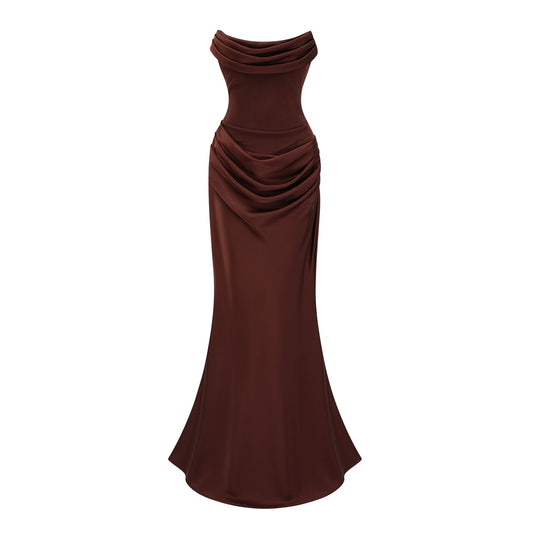 Vintage Bow Tie Pleated Floral Lace Fishtail Evening Maxi Dress - Cream