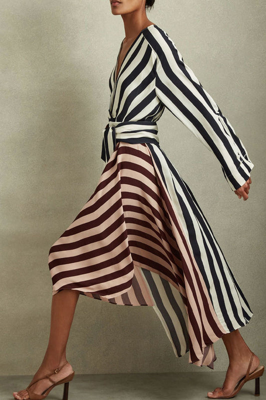 Celebrities Stripe Patchwork Deep V Neck Long Dresses