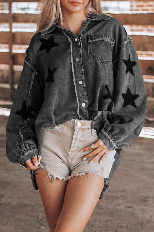 Casual Street The stars Distressed Patchwork Turndown Collar Long Sleeve Loose Denim Jacket