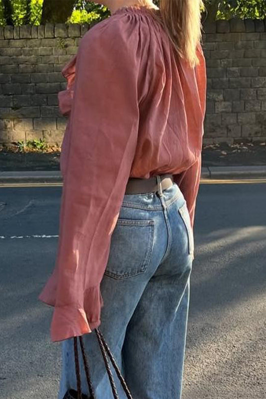 Casual Solid Color Lace Up Flounce V Neck Tops