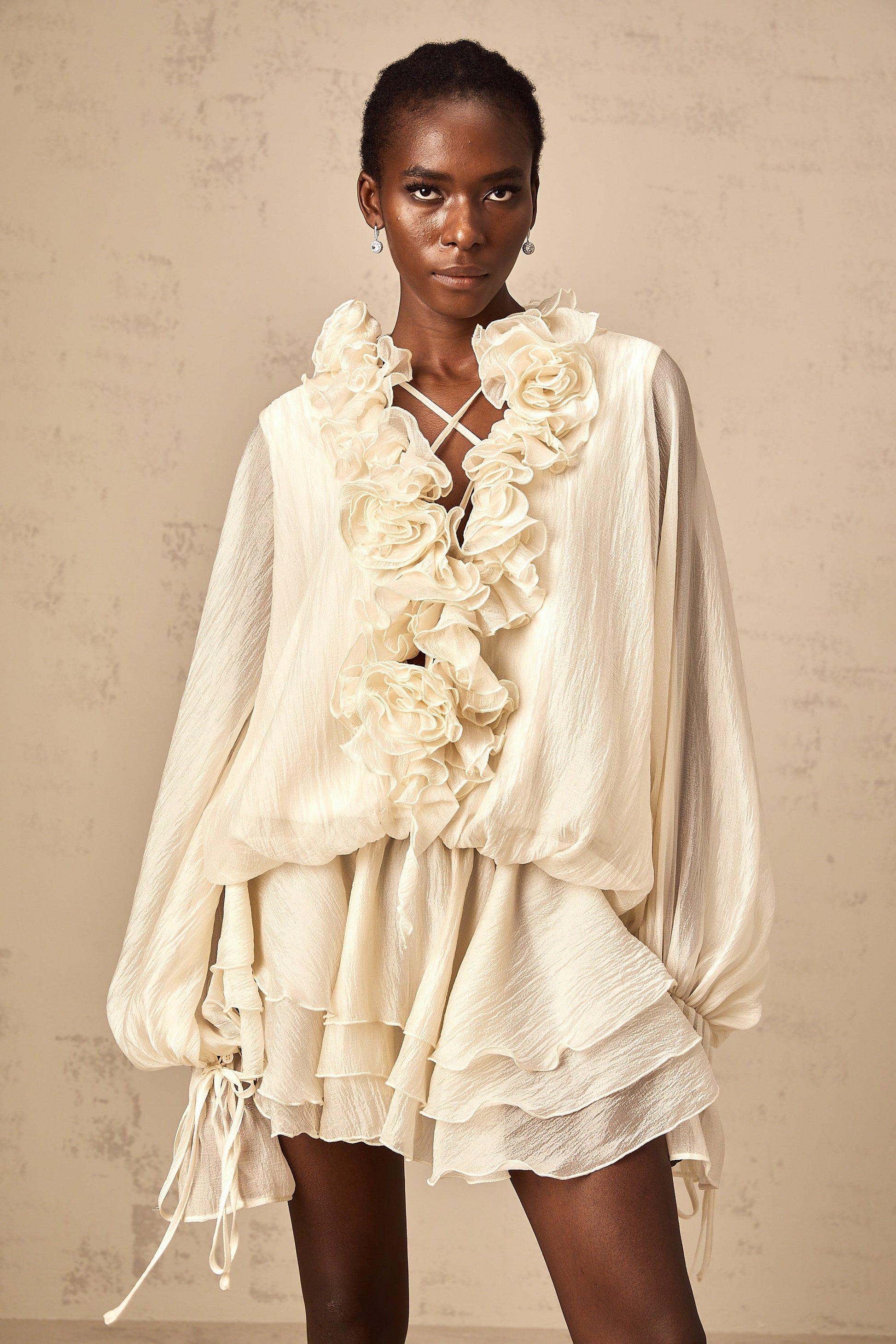 Zéphyrine floral-appliqué tiered mini dress in Neutrals